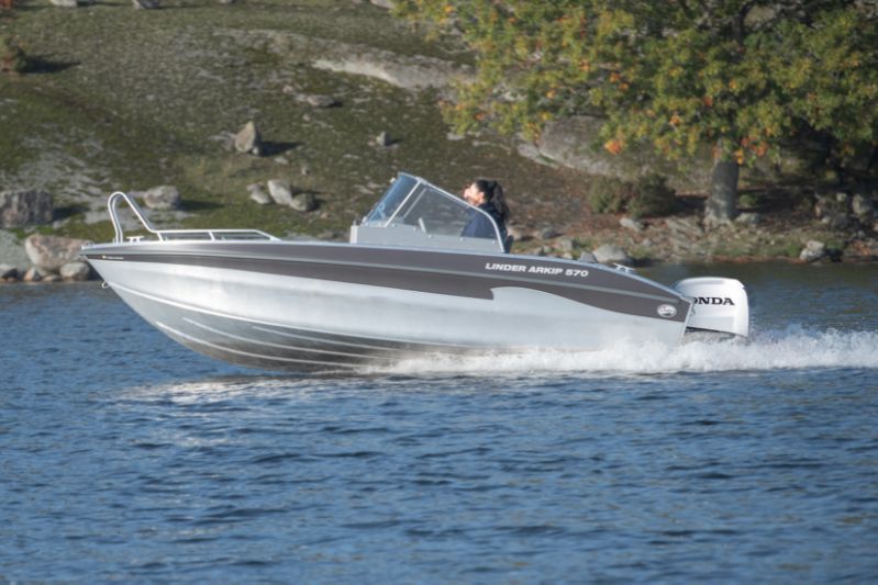 Nyheten Arkip 570 – en planande motorbåt för 6 personer med dubbelskrov. Ny pulpetlösning med integrerad dörr, riktiga vindrutor och vindrutetorkare. En skrovvinkel om 16° ger båten en låg planingströskel som vittnar om möjligheten till fart. Högre badbrygga med teleskopisk badstege. Både förare passagerare sitter bekvämt i stötdämpade stolar. Sittbrunnen har blivit större. Utrymmet mellan stolar och aktertoft har ökat. Flytkraft i skrovsidor, självläns och det självklara, ett 2,7 mm aluminiumskrov. Plats för 10 tum GPS. 3 års garanti.