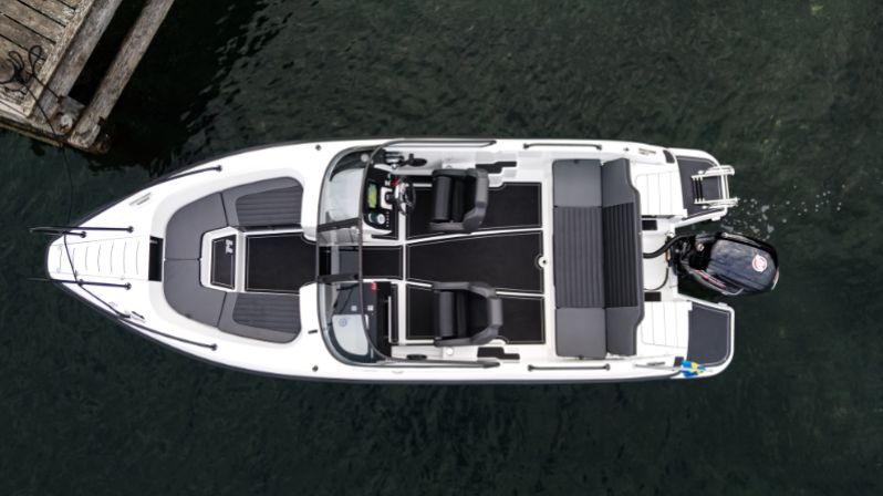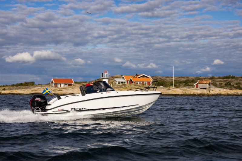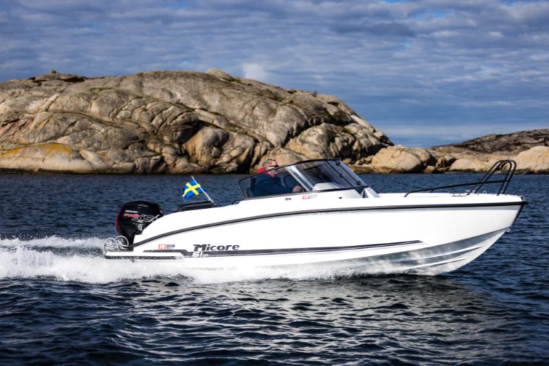 Efter många år med negativ ruta som signum för Micore kommer vi inför säsongen 2025 med denna bowrider i 6-meters klassen där rutan är traditionellt vänd mot styrplatsen. Badplattformar är standard på båten. Med smarta detaljer och snygg design till rätt pris tror vi oss kunna vinka på många 61br åkare till sommaren.