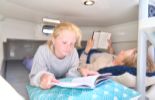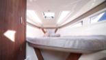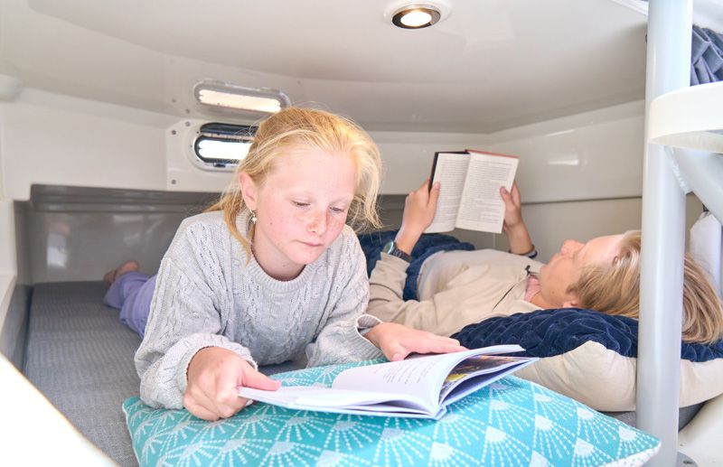 I ruffen sover 4 vuxna gott, tack vare klassledande utrymmen. Kabinen är ljus och luftig genom sina många ventiler och ljusinsläpp. Den separata toaletten har handfat och fönster. I sittbrunnen, om styrbord och direkt akter om förarplatsen, finns pentryt placerat. Detta innehåller spis, kylskåp och handfat med kran.