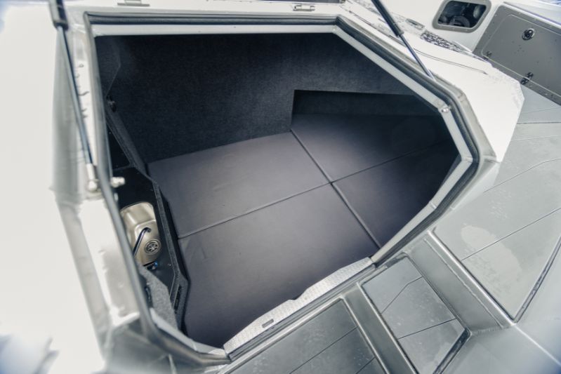 Det framgår tydligt av allt, att Anytec är byggd för tuff körning. Dess heltäckande aluminiumstruktur är exceptionellt styv och det V-formade skrovet med variabel vinkel är djupt: 23 grader akter och 48 grader i fören. Räcken, pollarna och T-topptaket är alla svetsade. Skrovet är en traditionell motorbåtsdesign, d.v.s. kraftiga steglister, men utan steg.