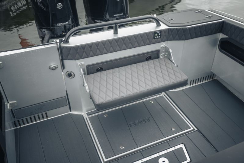860 T är kanske den tuffaste av trion. Speciellt med sina dubbla Mercury V10-utombordare på 400 hästkrafter och svartmålade T-top-tak utstrålar den en känsla av äventyr och maskulinitet. Och utseendet ljuger inte.